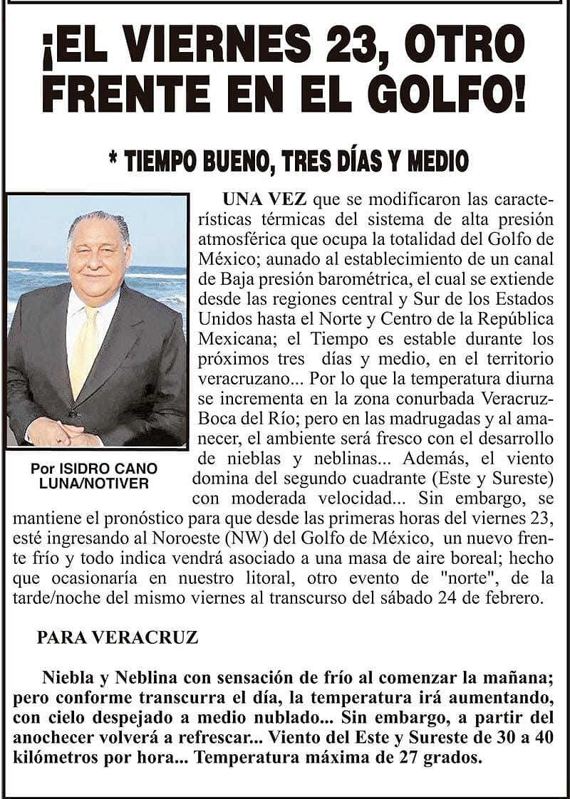 PRIMERA ¡EL VIERNES 23, OTRO FRENTE EN EL GOLFO! * TIEMPO BUENO, TRES DÍAS Y MEDIO 20 febrero 2024 Más Noticias LA PORTADA - LUNES 27 DE ABRIL 2026 LOS CARTONES ¡LOS RESCATAN! ¡PIRATA “BLANCO Y NEGRO”! ¡MUERE EL PRIMER CANDIDATO A GOBERNADOR DEL PAN! - DE VERACRUZ ¡PROTESTAN JUBILADOS! - DEL ISSSTE ¡‘SÚPER TRUMP’! - DETIENEN AL ATACANTE ¡MOCHILA SEGURA TRAS LOS CALAMBRES EN ESCUELAS! ¡AUMENTO SALARIAL QUEDÓ PULVERIZADO! - PURAS PERDIDAS ¡ESTÁN LA MIRA! - LOS EX ALCALDES