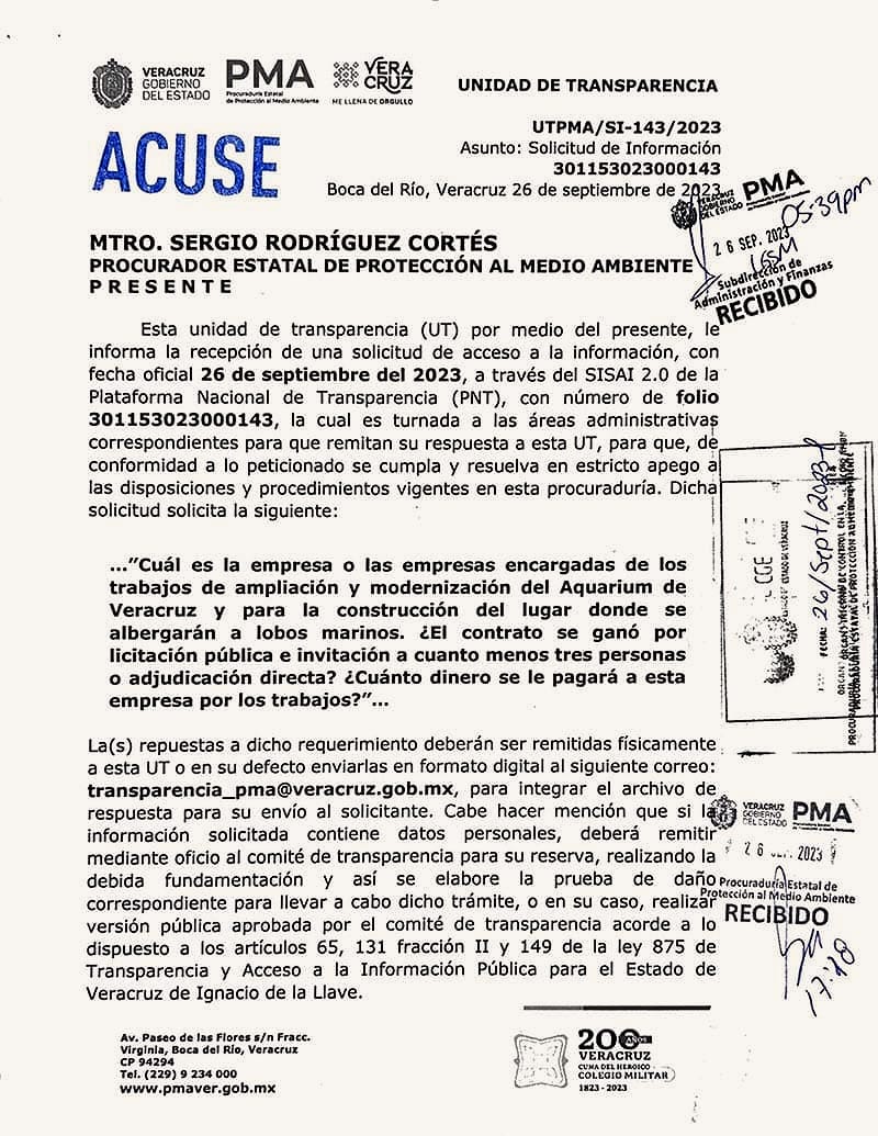 La Unidad de Transparencia de la dependencia, a través de la subdirección de administración y finanzas, detalló en el oficio PMAVER/SAF/OF-2294/2023, es respuesta a la solicitud 301153023000143, que las obras de ampliación y mejoras para albergar el llamado “Lobario” están a cargo de Arrendadora Constructo SA de CV.