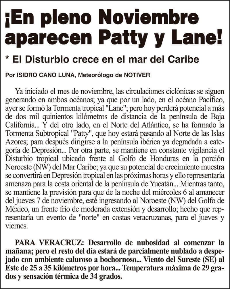 PRIMERA ¡EN PLENO NOVIEMBRE APARECEN PATTY Y LANE! - *EL DISTURBIO CRECE EN EL MAR DEL CARIBE 3 noviembre 2024 Más Noticias ¡YA HAY TERNA! - RAÚL PEIMBERT EN LA LISTA ¡“CEMENTERIO”! - DE ULÚAS ¡INAUGURA PATY OTRA CALLE! ¡NO LE CREYERON! - Y LO BUSCAN NOTI-MEME | - ECOS DEL INFORME! ¡VERÓNICA VA CON NAHLE! - Y AL CONGRESO ¡“FAST TRACK”! - *Mientras el Mariner salía y entraba de Pajaritos en Coatzacoalcos ¡OPERATIVO LUPE-REYES! ¡MANDAN LA BILLETIZA! - *Corea manda 150 mil dólares ¡CRISTINA GANA LA ELECCIÓN!