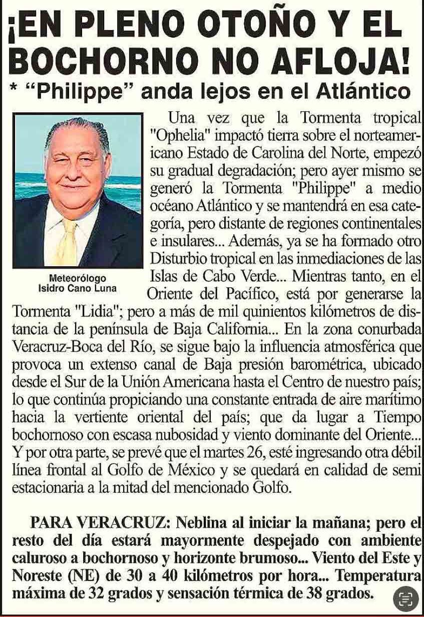 PRIMERA ¡EN PLENO OTOÑO Y EL BOCHORNO NO AFLOJA! “PHILIPPE” ANDA LEJOS EN EL ATLÁNTICO 24 septiembre 2023 Más Noticias ¡RIÑAS ESCOLARES! - Y SIGUEN ¡ECHARÁN OJO A LAS PLAYAS! ¡CLONAN EL FACE DE POZOS! - *Alerta subsecretario de Gobierno que quieren suplantar su identidad ¡POR TODOS LADOS! - LA MAREA NEGRA ¡YA HAY MAPA DIGITAL! - PARA LOS BACHES ¡ES VERACRUZANO! - Y AURELIANO VA A LA ASF ¡SIETE DENUNCIAS! - CONTRA EX ALCALDE DE SANTIAGO ¡VENDEN LOS CAMPOS BERTHA! ¡LE PUSO LA PISTOLA! - LA NUEVA ESCUELA ¡DE PISA Y CORRE! - PLOP