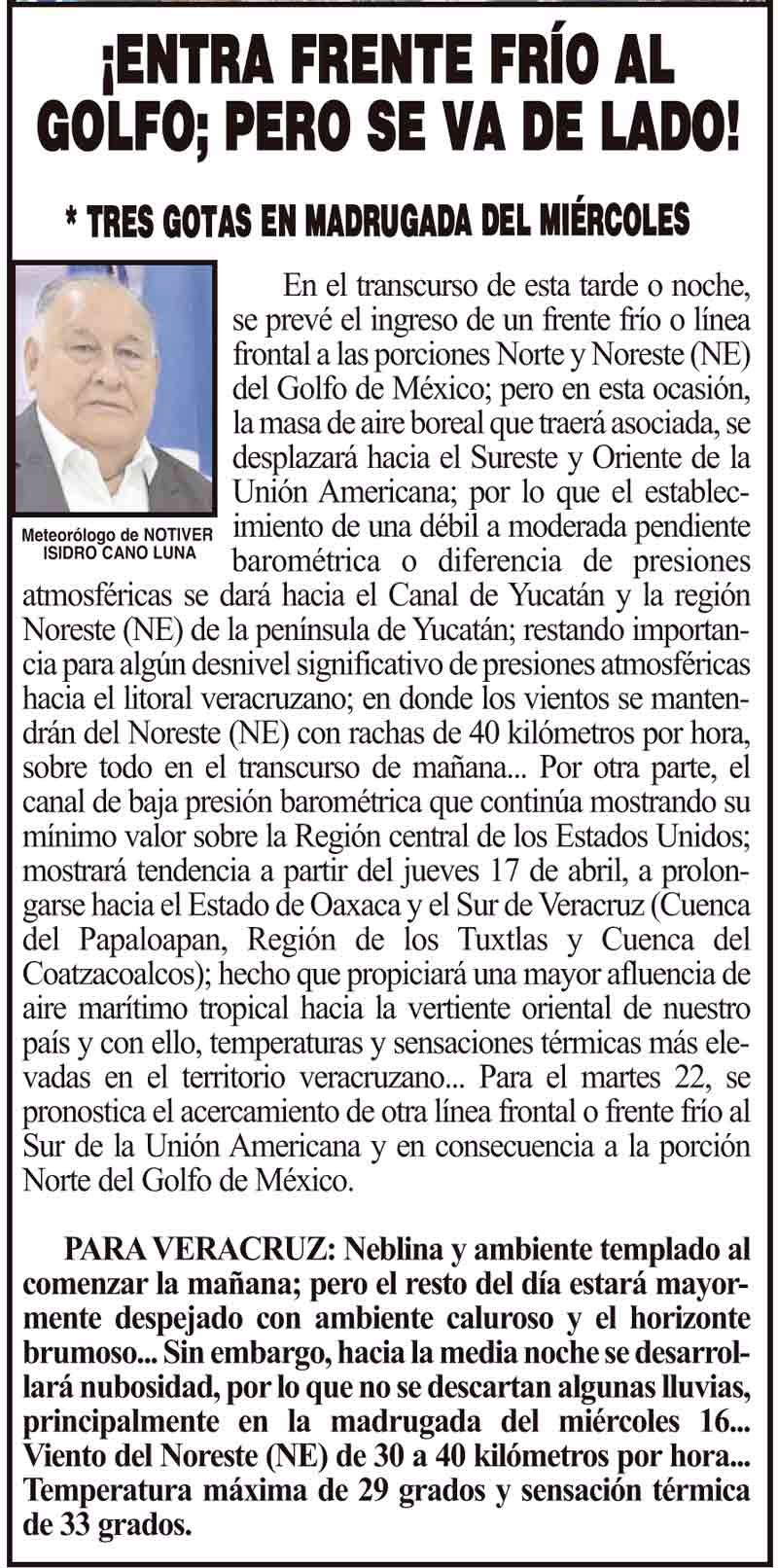 PRIMERA ¡ENTRA FRENTE FRÍO AL GOLFO; PERO SE VA DE LADO! - *TRES GOTAS EN MADRUGADA DEL MIÉRCOLES 15 abril 2025 Más Noticias ¡BLOQUEO DEL SECTOR SALUD EN PLAN DE RÍO! ¡TRAGEDIA EN LA AUTOPISTA VERACRUZ–XALAPA! NOTI-MEME | - YA LLEGÓ LA RAMA! LA ENCUESTA | - YA VIENE! ¡RECONOCIMIENTO A DIRIGENTE DE TAXISTAS! ¡LE VAN A ENTRAR! - *Claudia ordena a Nahle ¡QUIEREN MANDOS DE LA MARINA! - EN LAS POLICÍAS MUNICIPALES ¡ATACA EL VIRUS COXSACKIE, HAY 71 CASOS! - *Con mayor incidencia en 2025 y casos concentrados en Xalapa y Veracruz LOS CARTONES ¡SALMA SACA VIDEO! - RETEMUNDIAL...