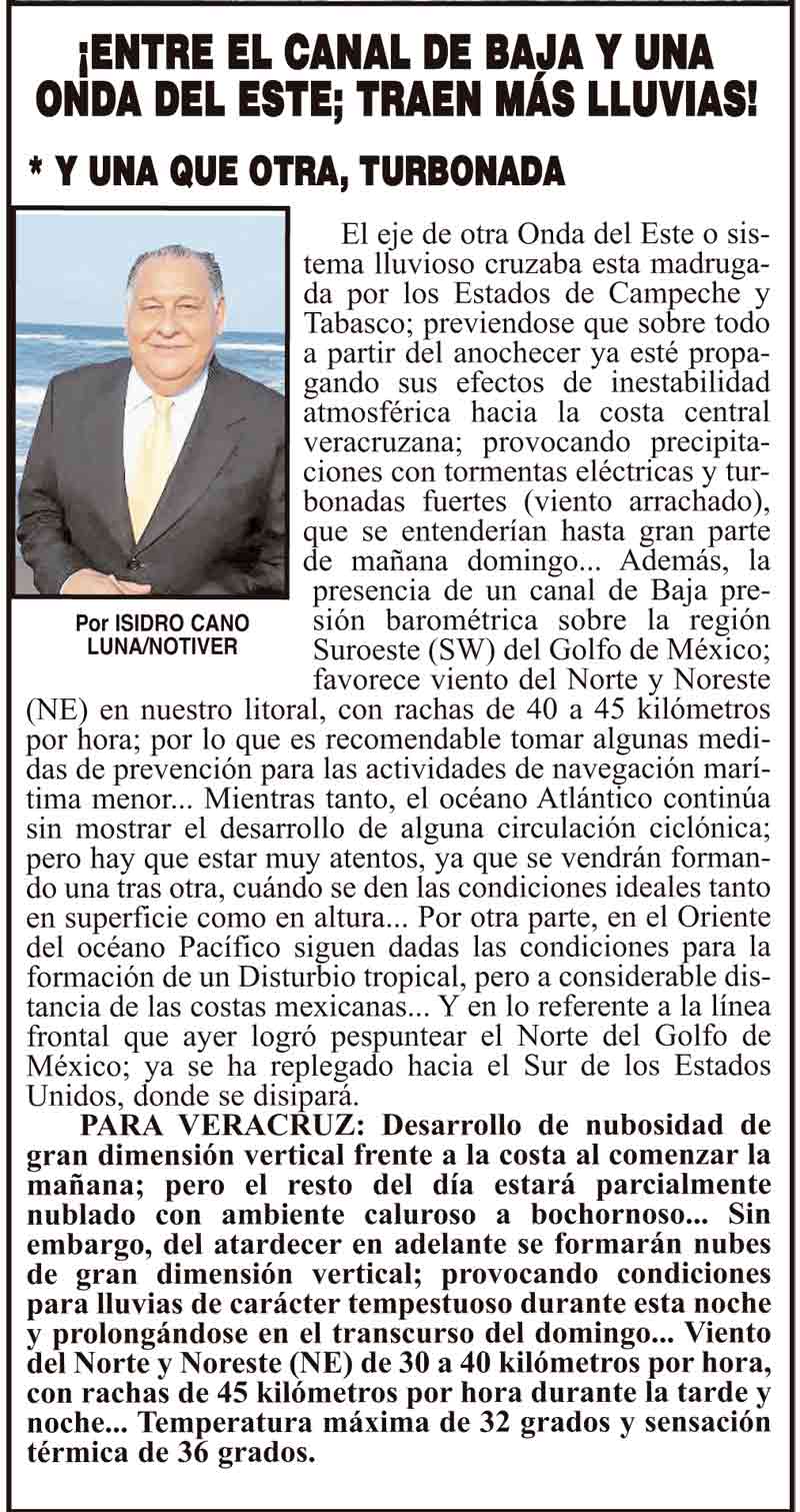 PRIMERA ¡ENTRE EL CANAL DE BAJA Y UNA ONDA DEL ESTE; TRAEN MÁS LLUVIAS! - *Y UNA QUE OTRA, TURBONADA 20 julio 2024 Más Noticias ¡YA HAY TERNA! - RAÚL PEIMBERT EN LA LISTA ¡“CEMENTERIO”! - DE ULÚAS ¡INAUGURA PATY OTRA CALLE! ¡NO LE CREYERON! - Y LO BUSCAN NOTI-MEME | - ECOS DEL INFORME! ¡VERÓNICA VA CON NAHLE! - Y AL CONGRESO ¡“FAST TRACK”! - *Mientras el Mariner salía y entraba de Pajaritos en Coatzacoalcos ¡OPERATIVO LUPE-REYES! ¡MANDAN LA BILLETIZA! - *Corea manda 150 mil dólares ¡CRISTINA GANA LA ELECCIÓN!