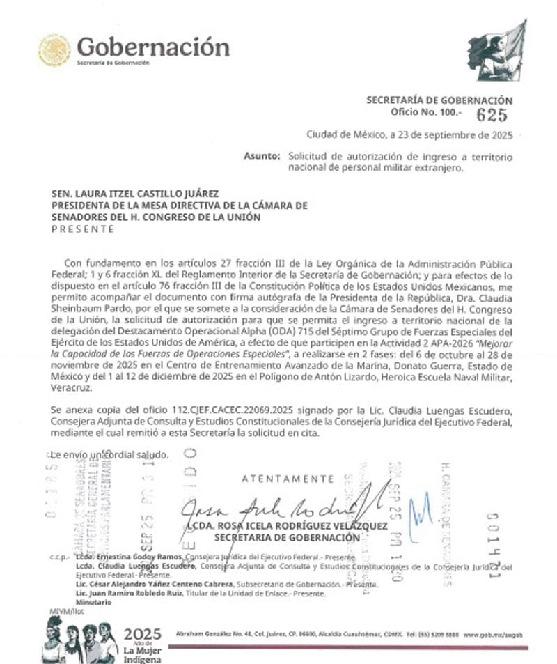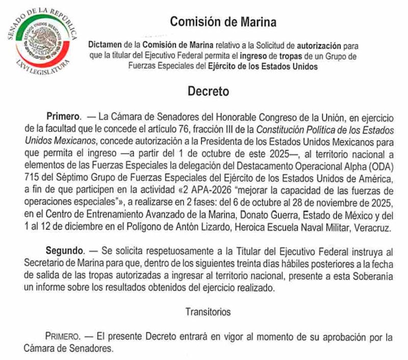 El Senado de la República aprobó la entrada de integrantes del Séptimo Grupo de Fuerzas Especiales de Estados Unidos para participar en tareas de capacitación conjunta, de la unidad de operaciones especiales del Destacamento Operacional Alfa ODA, un equipo de élite llamados Boinas Verdes.