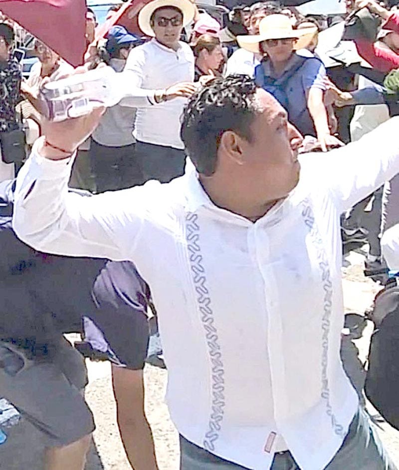 En videos que se compartieron en redes sociales, se observa que el servidor público lanza una botella de suero a los trabajadores de los juzgados y tribunales federales que llegaron a manifestarse en las inmediaciones de la avenida Madero y la calle Manuel Gutiérrez Zamora en contra de López Obrador, quien impulsó la reforma judicial ante la Cámara de Diputados.