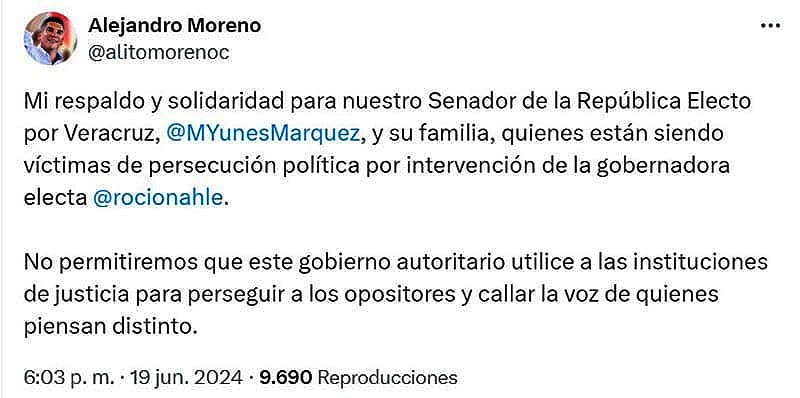 “Mi respaldo y solidaridad para nuestro Senador de la República Electo por Veracruz, @MYunesMarquez, y su familia, quienes están siendo víctimas de persecución política por intervención de la gobernadora electa @rocionahle. No permitiremos que este gobierno autoritario utilice a las instituciones de justicia para perseguir a los opositores y callar la voz de quienes piensan distinto”.