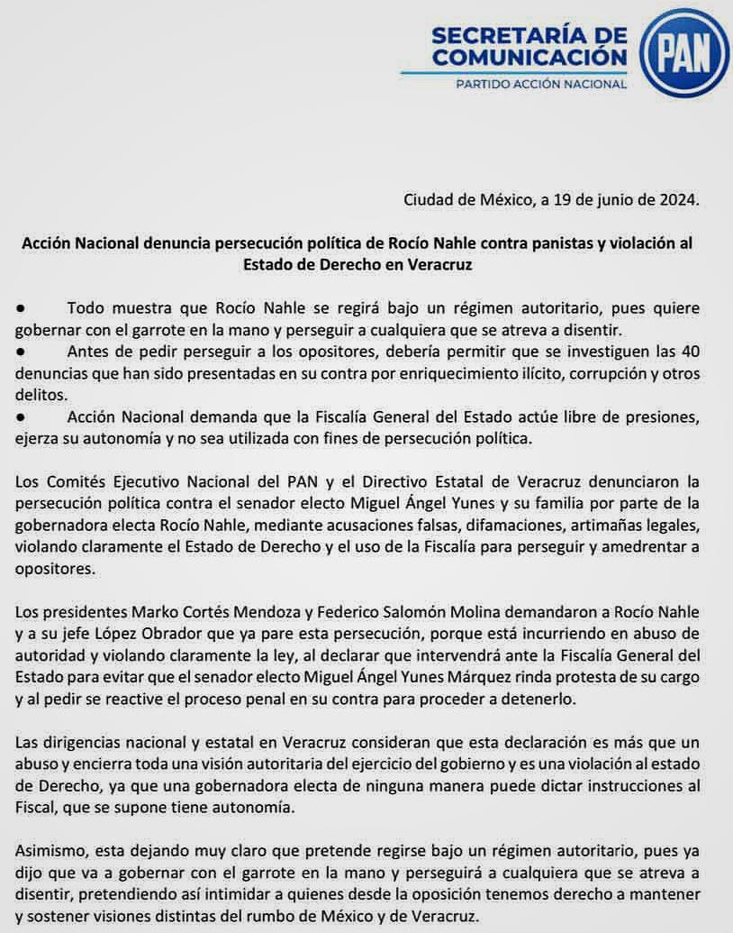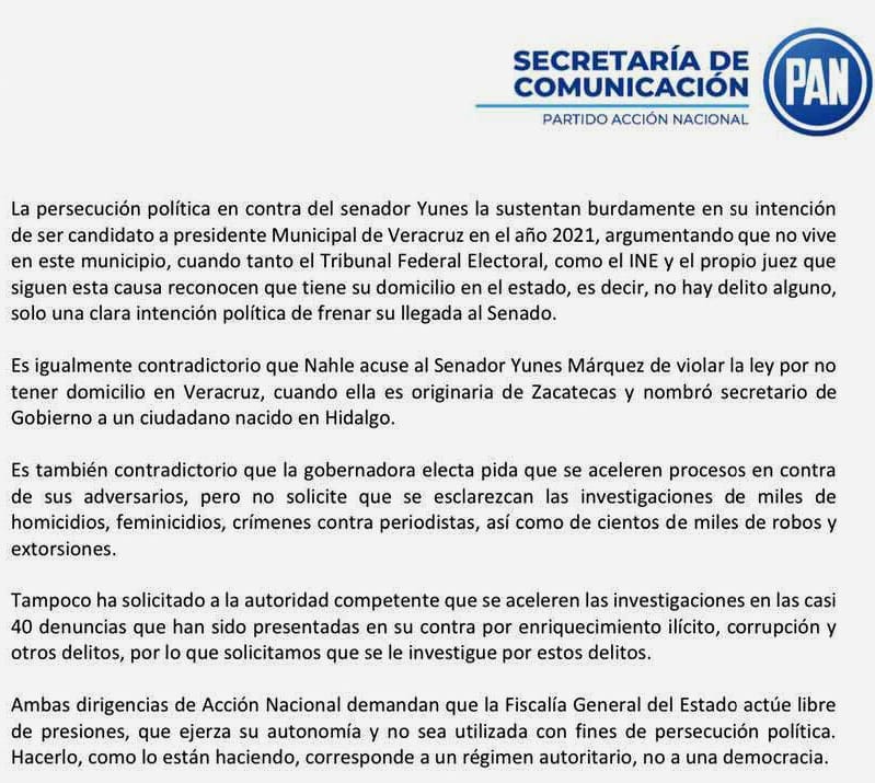 “Todo muestra que Rocío Nahle se regirá bajo un régimen autoritario. Denunciamos la persecución política contra el senador electo @MYunesMarquez y su familia, violando claramente el Estado de Derecho y haciendo uso ilegal de la Fiscalía. Antes de pedir perseguir a los opositores, debería permitir se investiguen las 40 denuncias que han sido presentadas en su contra por enriquecimiento ilícito, corrupción y otros delitos”.