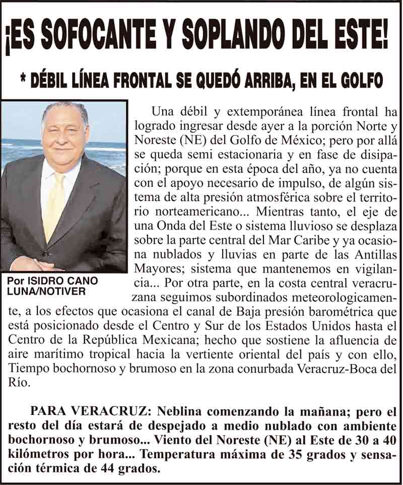 PRIMERA ¡ES SOFOCANTE Y SOPLANDO DEL ESTE! - *DÉBIL LÍNEA FRONTAL SE QUEDÓ ARRIBA, EN EL GOLFO 29 mayo 2024 Más Noticias ¡YA HAY TERNA! - RAÚL PEIMBERT EN LA LISTA ¡“CEMENTERIO”! - DE ULÚAS ¡INAUGURA PATY OTRA CALLE! ¡NO LE CREYERON! - Y LO BUSCAN NOTI-MEME | - ECOS DEL INFORME! ¡VERÓNICA VA CON NAHLE! - Y AL CONGRESO ¡“FAST TRACK”! - *Mientras el Mariner salía y entraba de Pajaritos en Coatzacoalcos ¡OPERATIVO LUPE-REYES! ¡MANDAN LA BILLETIZA! - *Corea manda 150 mil dólares ¡CRISTINA GANA LA ELECCIÓN!