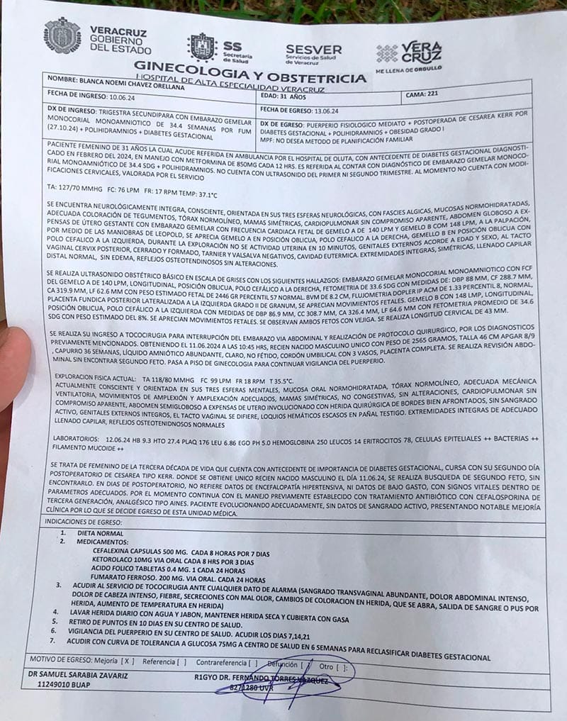 Con un presunto embarazo gemelar llegó al Hospital de Alta Especialidad de Veracruz, Blanca Noemí Chávez, originaria de Honduras, pero después del parto le dijeron que solo nació uno y ahora junto con su esposo reclama saber qué fue lo que pasó con el otro producto que llevaba en su vientre.