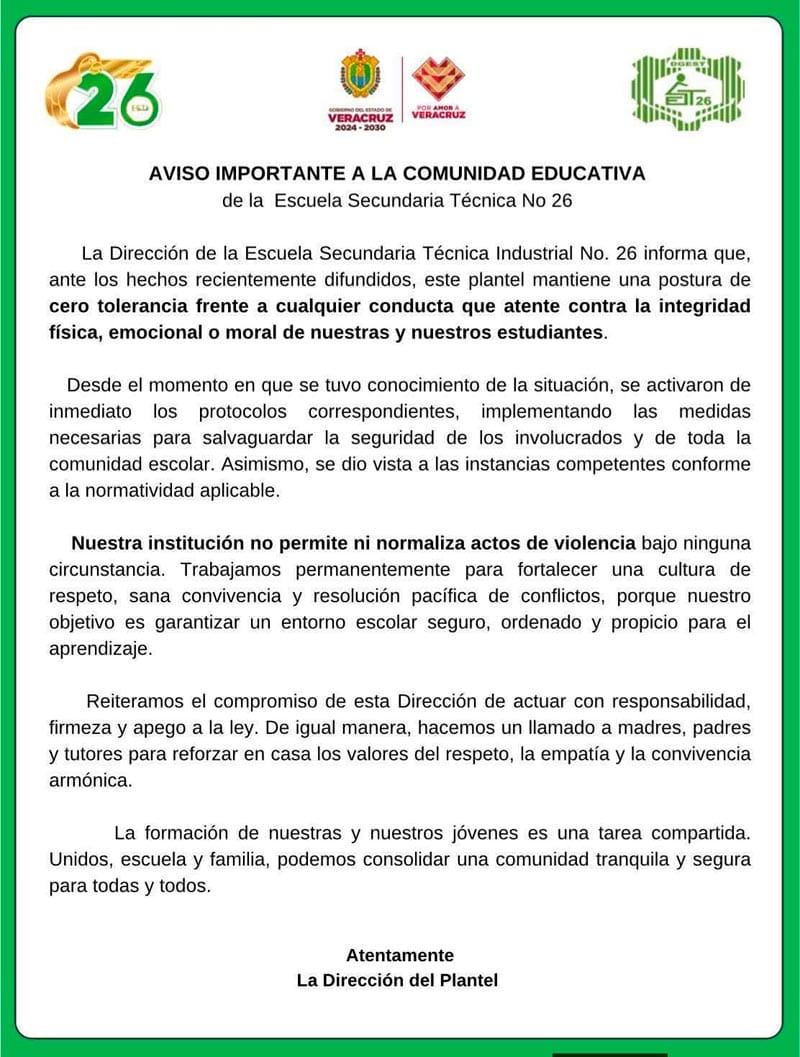 Un alumno de tercer año de la Secundaria Técnica Industrial No. 26 (ESTI 26 de la avenida Díaz Mirón), de la ciudad de Veracruz, le dio una golpiza a una de sus compañeras, hecho que quedó grabado en varios videos tomados desde los celulares de los propios alumnos.