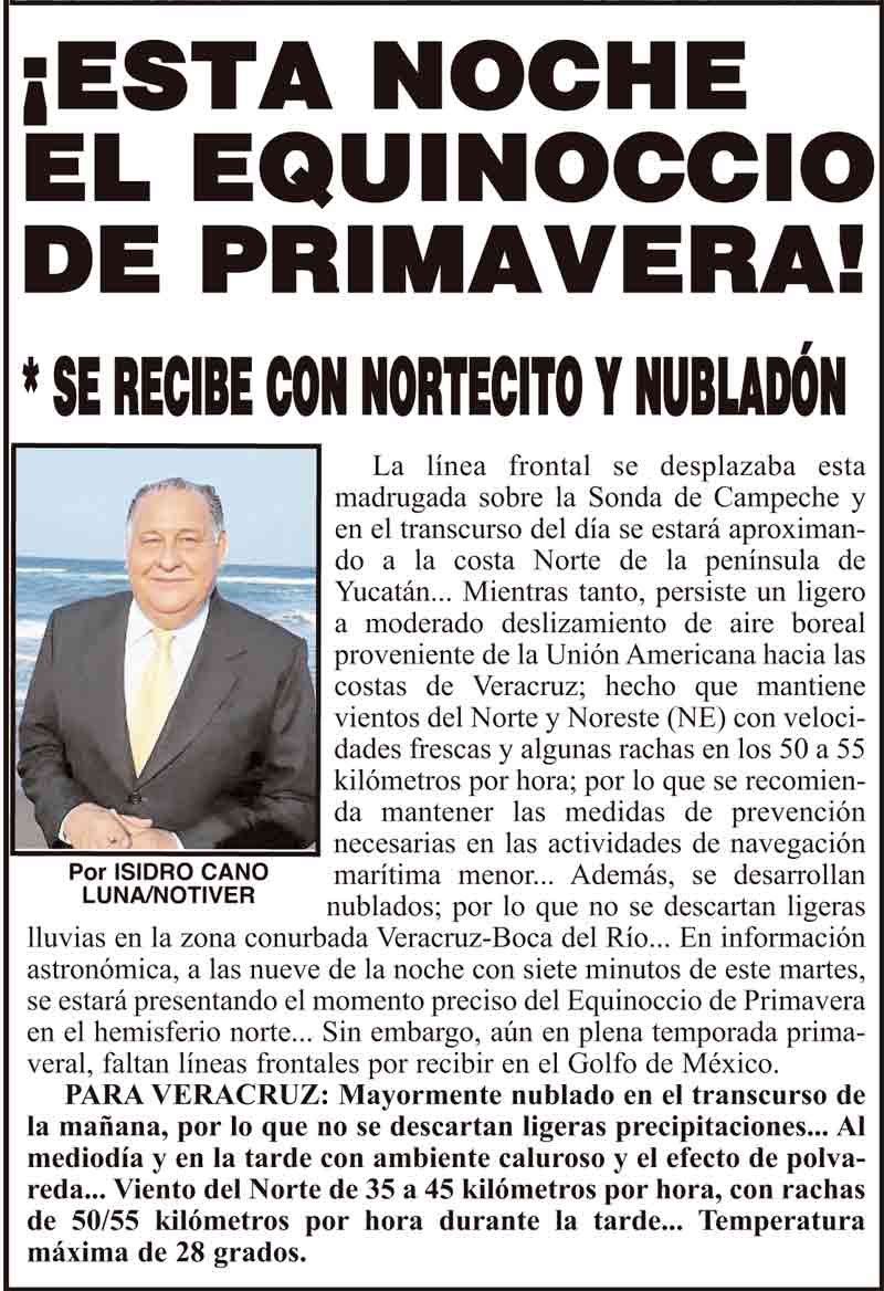 PRIMERA ¡ESTA NOCHE EL EQUINOCCIO DE PRIMAVERA! - * SE RECIBE CON NORTECITO Y NUBLADÓN 19 marzo 2024 Más Noticias LA PORTADA - SÁBADO 6 DE DICIEMBRE 2025 ¡SE ESTÁ FORMANDO UN INTENSO "NORTE" PARA EL LUNES 8! - *UN FIN DE SEMANA CON CALOR, BRUMA Y DEL ESTE ¡YA HAY TERNA! - RAÚL PEIMBERT EN LA LISTA ¡“CEMENTERIO”! - DE ULÚAS ¡INAUGURA PATY OTRA CALLE! ¡NO LE CREYERON! - Y LO BUSCAN NOTI-MEME | - ECOS DEL INFORME! ¡VERÓNICA VA CON NAHLE! - Y AL CONGRESO ¡“FAST TRACK”! - *Mientras el Mariner salía y entraba de Pajaritos en Coatzacoalcos ¡OPERATIVO LUPE-REYES!