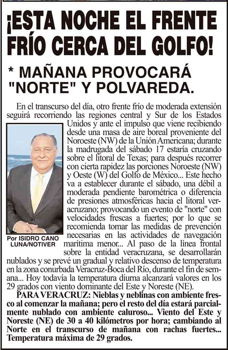 PRIMERA ¡ESTA NOCHE EL FRENTE FRÍO CERCA DEL GOLFO! * MAÑANA PROVOCARÁ "NORTE" Y POLVAREDA... 17 febrero 2024 Más Noticias LA PORTADA - DOMINGO 12 DE ABRIL 2026 ¡DANIELA LLEGA A 100 DÍAS! LOS CARTONES ¡“PIRATAS DEL ASFALTO” - NO PARAN ASALTOS LA ENCUESTA | - DICE QUE HA DE SER OTRO DERRAME! ¡SEGUNDO ROUND! - TAN TAN ¡ROYA AFECTA 40 MIL HECTÁREAS DE CULTIVO DE CAFÉ EN VERACRUZ! ¡A GARROTAZOS! - RUDEZA INNECESARIA... ¡A BALAZOS! - SE PASARON... ¡SON DIRIGENTES OBREROS! - LOS BALEADOS DE LA PANCHO VILLA
