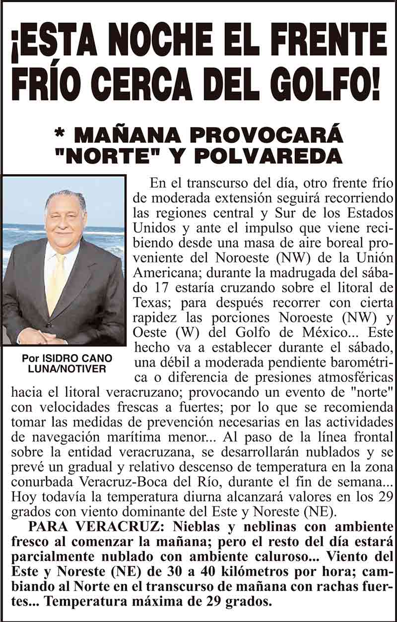 PRIMERA ¡ESTA NOCHE EL FRENTE FRÍO CERCA DEL GOLFO! * MAÑANA PROVOCARÁ "NORTE" Y POLVAREDA 16 febrero 2024 Más Noticias ¡YA HAY TERNA! - RAÚL PEIMBERT EN LA LISTA ¡“CEMENTERIO”! - DE ULÚAS ¡INAUGURA PATY OTRA CALLE! ¡NO LE CREYERON! - Y LO BUSCAN NOTI-MEME | - ECOS DEL INFORME! ¡VERÓNICA VA CON NAHLE! - Y AL CONGRESO ¡“FAST TRACK”! - *Mientras el Mariner salía y entraba de Pajaritos en Coatzacoalcos ¡OPERATIVO LUPE-REYES! ¡MANDAN LA BILLETIZA! - *Corea manda 150 mil dólares ¡CRISTINA GANA LA ELECCIÓN!