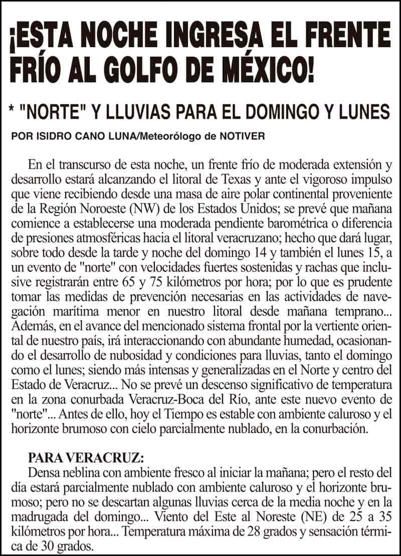 PRIMERA ¡ESTA NOCHE INGRESA EL FRENTE FRÍO AL GOLFO DE MÉXICO! - *"NORTE" Y LLUVIAS PARA EL DOMINGO Y LUNES 13 diciembre 2025 Más Noticias ¡PARAN EN LA UPAV! - *300 estudiantes sin clases ¡MULTADOS! - *PAN el más castigado con 6 millones ¡HOTELEROS Y AGENCIAS DE VIAJES SE LA FIRMAN! LOS CARTONES ¡QUIEREN A ROCHA Y 9 MÁS! - EN LA CORTE DE NUEVA YORK ¡REBELIÓN DE PESCADORES! - Y PARAN EL NORTE ¡ENCUENTRAN A LA MAESTRA! - DESAPARECIDA EN LA INUNDACIÓN EN ILAMATLÁN MARYJOSE VS. CAB! ¡CUI SE PLACEA EN PALACIO! - *Ni así y lo mandan hasta Gayola LA ENCUESTA | - LO QUIERE TRUMP!