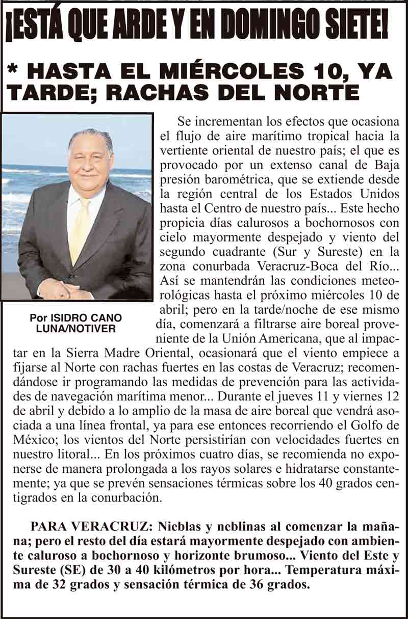 PRIMERA ¡ESTÁ QUE ARDE Y EN DOMINGO SIETE! - * HASTA EL MIÉRCOLES 10, YA TARDE; RACHAS DEL NORTE 7 abril 2024 Más Noticias ¡HOY SOPLA FRESCO Y DE FRENTE! - *PERO EL LUNES 8, ESTARÁ FUERTE Y CON LLUVIAS. LA ENCUESTA | - ME ESTÁS OYENDO INÚTIL?... ¡CON BAILONGOS QUIEREN AYUDAR A LOS DAMNIFICADOS DEL NORTE! - *El mismo Alor, toca los timbales ¡YA SE LA APROBARON! - REFORMA PARA LA FISCALÍA ESTATAL NOTI-MEME | - ASÍ ESTUVO EL INFORME... ¡MÁS DE 9 MIL MILLONES! - *Eso costaría cancelar en Veracruz al Grupo MAS ¡LE DAN LUZ VERDE! - DESDE GUATEMALA ¡EL CUARTO! ¡Y COM-PA-RE-CIÓ! - ÁNDALE... ¡NO SE VA LISBETH AURELIA! - *Descarta ir a la Fiscalía y que seguirá como magistrada