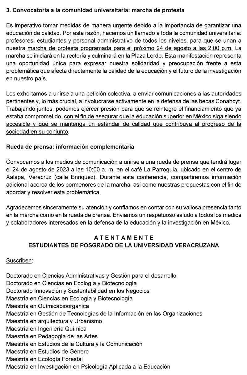 “La educación y la investigación constituyen pilares fundamentales para el desarrollo de México, y esta medida va en detrimento de la innovación y la promoción del conocimiento. Resulta inaceptable que el Conahcyt haya decidido reducir drásticamente las becas destinadas a los posgrados, después de haber llevado a cabo una evaluación injusta que carece de transparencia en sus procedimientos. Esta acción plantea serias preocupaciones en relación con la vulneración de los derechos humanos a la educación y la igualdad de oportunidades”.