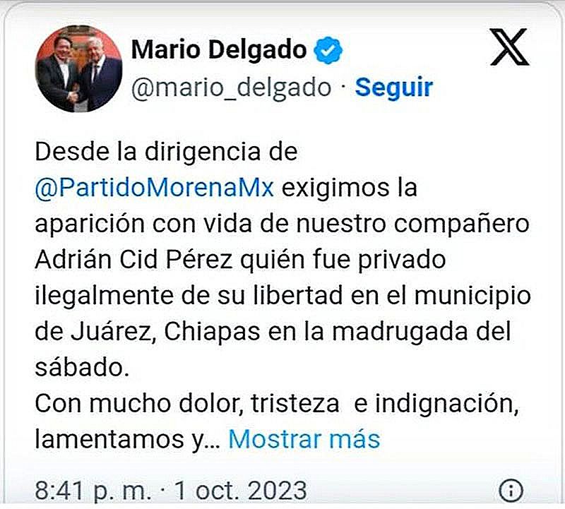 Desde la dirigencia de @PartidoMorenaMx exigimos la aparición con vida de nuestro compañero Adrián Cid Pérez quién fue privado ilegalmente de su libertad en el municipio de Juárez, Chiapas en la madrugada del sábado.