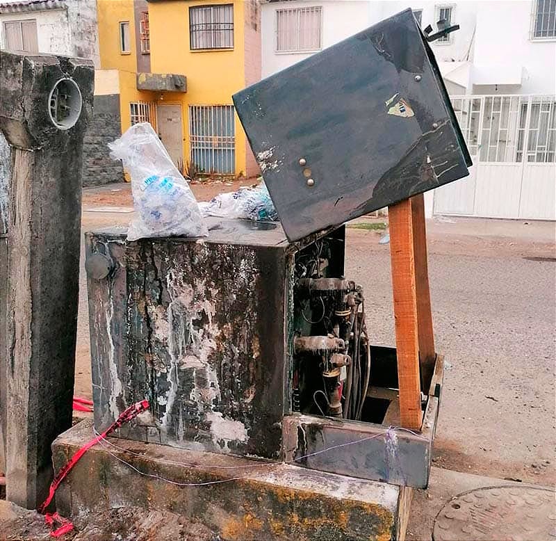 El fin de semana pasado dicen los vecinos que le colocaron 27 bolsas de hielo al transformador para que funcionara el problema es que con el agua que escurre el al aparato éste se está sulfatando lo que implica que en algún momento sucederá un problema definitivo por ello los vecinos siguen pidiendo a CFE que cambie el transformador pero la respuesta es que van a ir pero en más de una semana no se ha presentado ninguna cuadrilla y sobre el cambio del equipo les dicen que no.