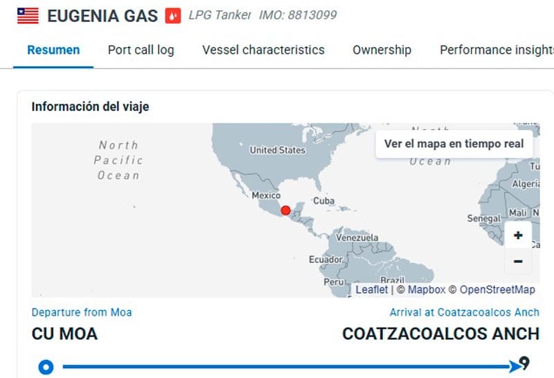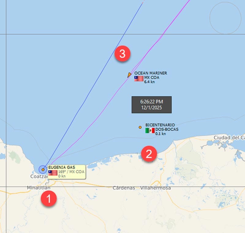 Otro detalle es que mientras llegaba el Ocean Mariner por segunda vez en 15 días, otro barco cisterna el Eugenia Gas también con bandera de Liberia ya se encontraba en Coatzacoalcos.