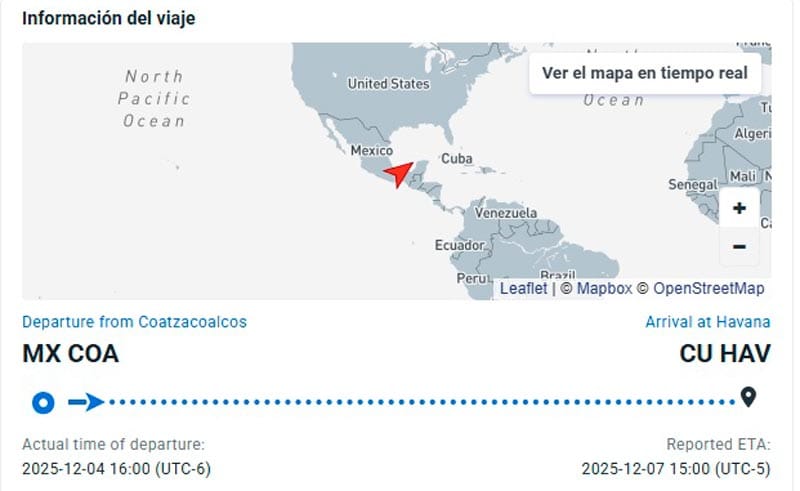Este barco salió del puerto de Moa en Cuba desde el 10 de noviembre y llegó el 23 y actualmente todavía se encuentra en aguas del Golfo de México, está en espera de carga.