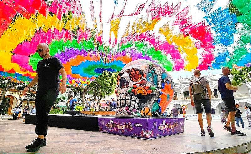 Cabe destacar que el zócalo del puerto fue decorado con papel de colores y una calavera gigante y una catrina.
