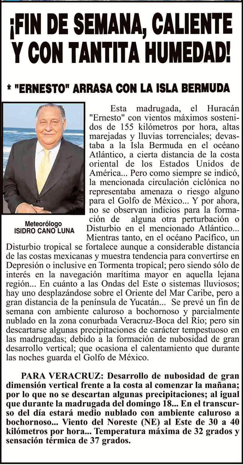 PRIMERA ¡FIN DE SEMANA, CALIENTE Y CON TANTITA HUMEDAD! - *"ERNESTO" ARRASA CON LA ISLA BERMUDA 17 agosto 2024 Más Noticias ¡YA HAY TERNA! - RAÚL PEIMBERT EN LA LISTA ¡“CEMENTERIO”! - DE ULÚAS ¡INAUGURA PATY OTRA CALLE! ¡NO LE CREYERON! - Y LO BUSCAN NOTI-MEME | - ECOS DEL INFORME! ¡VERÓNICA VA CON NAHLE! - Y AL CONGRESO ¡“FAST TRACK”! - *Mientras el Mariner salía y entraba de Pajaritos en Coatzacoalcos ¡OPERATIVO LUPE-REYES! ¡MANDAN LA BILLETIZA! - *Corea manda 150 mil dólares ¡CRISTINA GANA LA ELECCIÓN!
