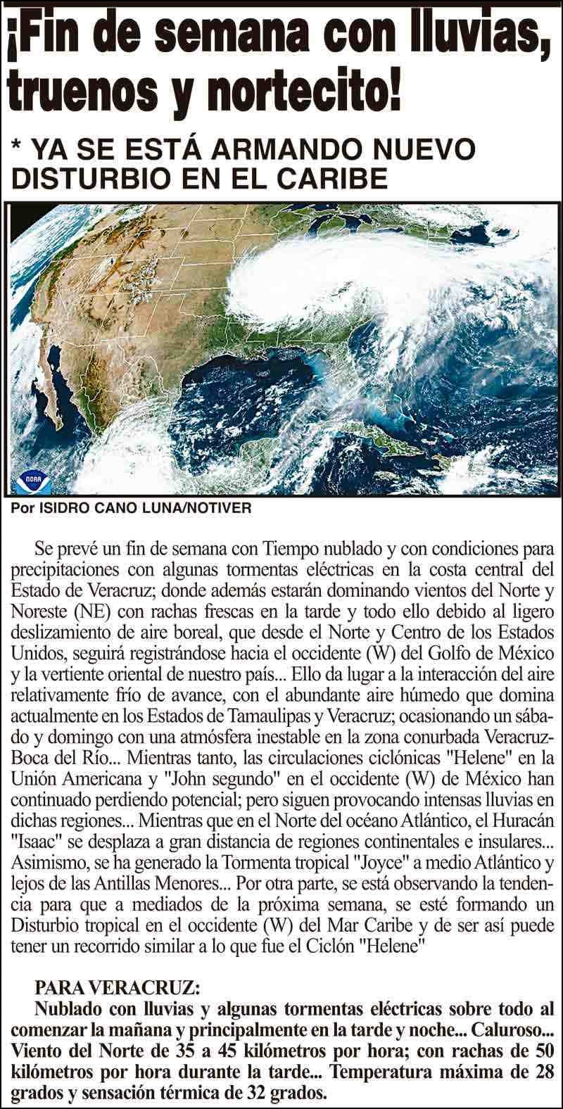 PRIMERA ¡FIN DE SEMANA CON LLUVIAS, TRUENOS Y NORTECITO! - *YA SE ESTÁ ARMANDO NUEVO DISTURBIO EN EL CARIBE 28 septiembre 2024 Más Noticias ¡YA HAY TERNA! - RAÚL PEIMBERT EN LA LISTA ¡“CEMENTERIO”! - DE ULÚAS ¡INAUGURA PATY OTRA CALLE! ¡NO LE CREYERON! - Y LO BUSCAN NOTI-MEME | - ECOS DEL INFORME! ¡VERÓNICA VA CON NAHLE! - Y AL CONGRESO ¡“FAST TRACK”! - *Mientras el Mariner salía y entraba de Pajaritos en Coatzacoalcos ¡OPERATIVO LUPE-REYES! ¡MANDAN LA BILLETIZA! - *Corea manda 150 mil dólares ¡CRISTINA GANA LA ELECCIÓN!