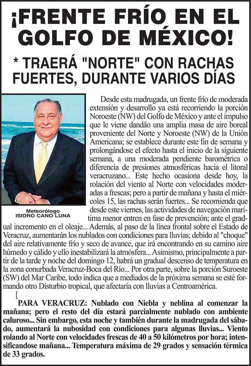 PRIMERA ¡FRENTE FRÍO EN EL GOLFO DE MÉXICO! * TRAERÁ "NORTE" CON RACHAS FUERTES, DURANTE VARIOS DÍAS 10 noviembre 2023 Más Noticias ¡PASA EL PLAN B! - TOPE A REGIEDURÍAS ¡VINO TERESO! - EL DE LA CTM ¡PARALIZADOS! - CAOS EN CHICONTEPEC ¡YA HAY CONSEJO DE SALUD MENTAL! ¡VAN CONTRA INVASORES! - DE MANGLARES ¡NO QUIEREN ‘CHOU’! - Y LA REVIENTAN... ¡EJECUTAN A LÍDER DE LA CTM! - EN IXHUATLÁN DEL SURESTE ¡MUERE MARTHA ELSA DURAZZO! - LUTO EN LAS LETRAS ¡BUSCAN EVITAR FRAUDES EN LA COMPRA DE COCHES! ¡PÁNICO EN PLAZA VALLE! - EN ORIZABA