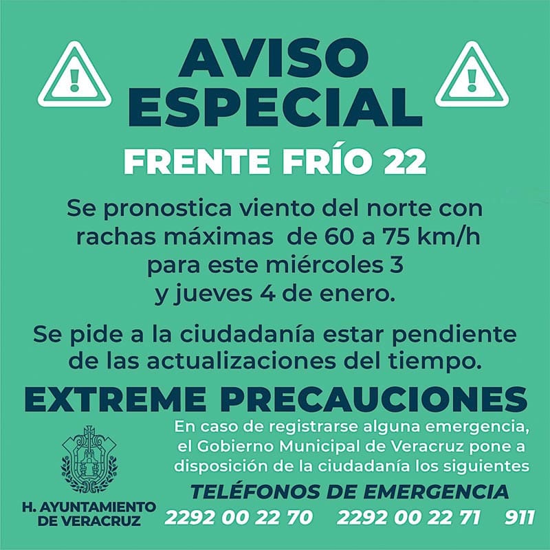 El Gobierno Municipal de Veracruz, a través de la Unidad de Protección Civil, emite un aviso especial por la entrada del Frente Frío No. 22 en el puerto de Veracruz...