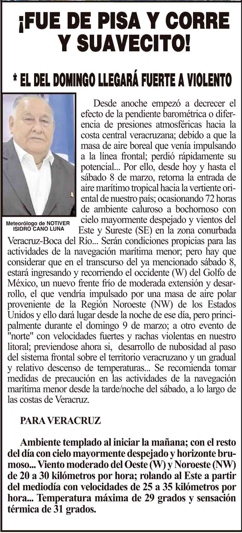 PRIMERA ¡FUE DE PISA Y CORRE Y SUAVECITO! - *EL DEL DOMINGO LLEGARÁ FUERTE A VIOLENTO 6 marzo 2025 Más Noticias ¡HOY SOPLA FRESCO Y DE FRENTE! - *PERO EL LUNES 8, ESTARÁ FUERTE Y CON LLUVIAS. LA ENCUESTA | - ME ESTÁS OYENDO INÚTIL?... ¡CON BAILONGOS QUIEREN AYUDAR A LOS DAMNIFICADOS DEL NORTE! - *El mismo Alor, toca los timbales ¡YA SE LA APROBARON! - REFORMA PARA LA FISCALÍA ESTATAL NOTI-MEME | - ASÍ ESTUVO EL INFORME... ¡MÁS DE 9 MIL MILLONES! - *Eso costaría cancelar en Veracruz al Grupo MAS ¡LE DAN LUZ VERDE! - DESDE GUATEMALA ¡EL CUARTO! ¡Y COM-PA-RE-CIÓ! - ÁNDALE... ¡NO SE VA LISBETH AURELIA! - *Descarta ir a la Fiscalía y que seguirá como magistrada
