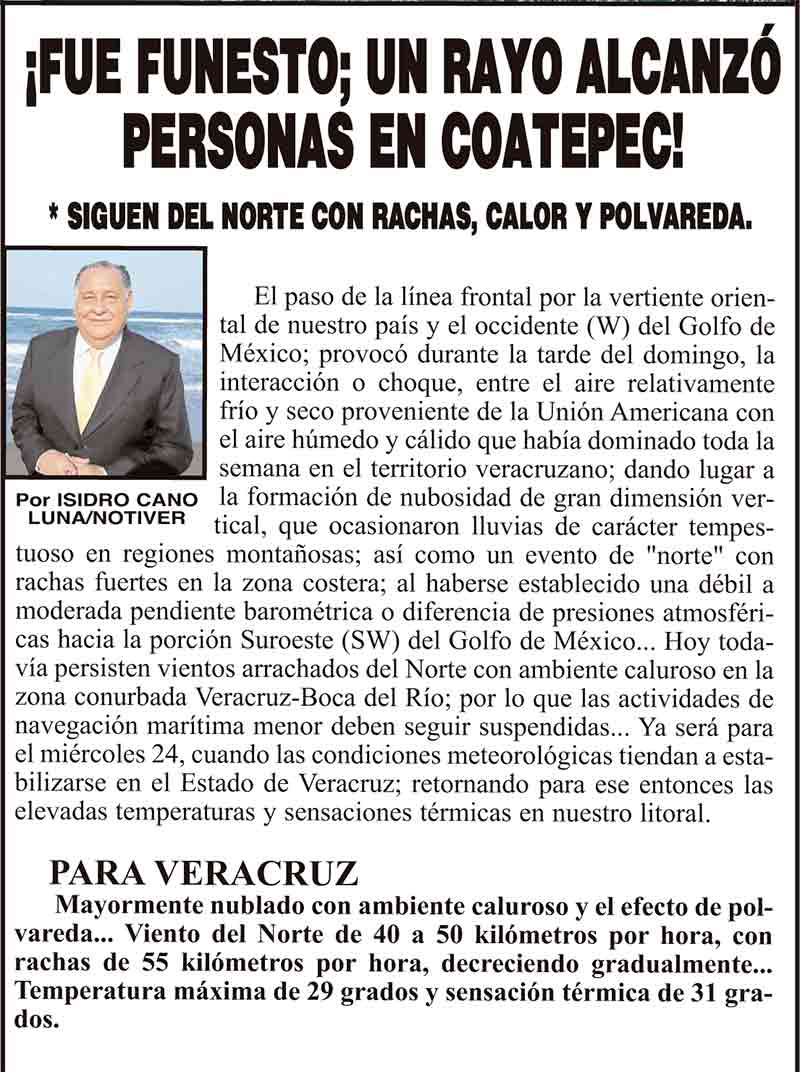 PRIMERA ¡FUE FUNESTO; UN RAYO ALCANZÓ PERSONAS EN COATEPEC! - * SIGUEN DEL NORTE CON RACHAS, CALOR Y POLVAREDA 22 abril 2024 Más Noticias ¡YA HAY TERNA! - RAÚL PEIMBERT EN LA LISTA ¡“CEMENTERIO”! - DE ULÚAS ¡INAUGURA PATY OTRA CALLE! ¡NO LE CREYERON! - Y LO BUSCAN NOTI-MEME | - ECOS DEL INFORME! ¡VERÓNICA VA CON NAHLE! - Y AL CONGRESO ¡“FAST TRACK”! - *Mientras el Mariner salía y entraba de Pajaritos en Coatzacoalcos ¡OPERATIVO LUPE-REYES! ¡MANDAN LA BILLETIZA! - *Corea manda 150 mil dólares ¡CRISTINA GANA LA ELECCIÓN!