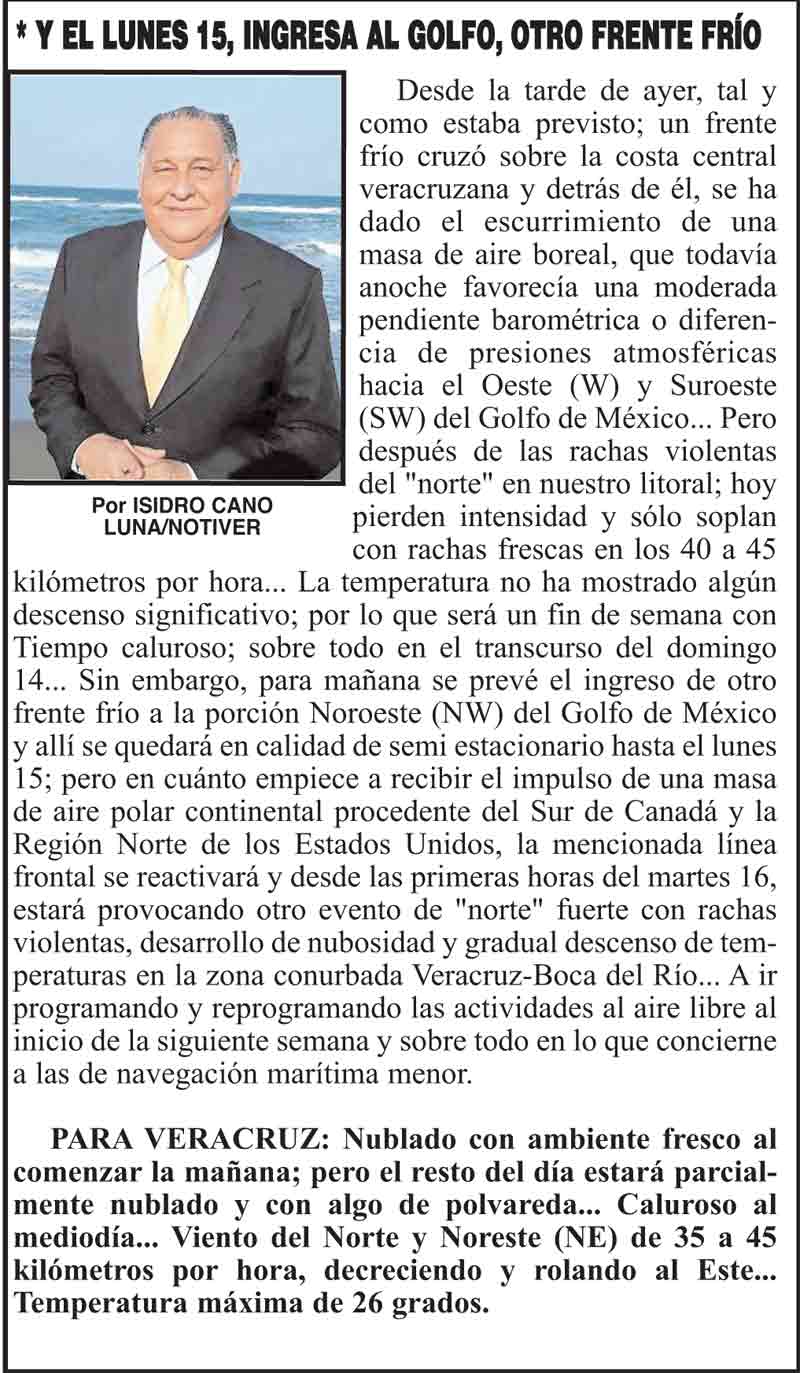 PRIMERA ¡FUE UN PASÓN, CON RACHAS DE 85 KPH! * Y EL LUNES 15, INGRESA AL GOLFO, OTRO FRENTE FRÍO 13 enero 2024 Más Noticias LA PORTADA - DOMINGO 19 DE ABRIL 2026 ¡RACING YA PAGÓ SANCIÓN! - FEDERACIÓN DE FÚTBOL ¡ALERTA EN CAZONES! - POR PECES MUERTOS ¡HABEMUS AGENTA MUNICIPAL! ¡APAGARÁN 507 VELITAS! ¡CARRERA EN TACONES DE MUAC! ¡INVITA IMSS VERACRUZ NORTE A REALIZARSE MASTOGRAFÍAS PARA LA DETECCIÓN OPORTUNA DE CÁNCER DE MAMA! ¡LE LLEVAN BRIGADA MÉDICA! ¡SON CHIVOS EXPLICATORIOS! - YA SE SUPO ¡MARTÍN GARRIK, DJ GLOBAL!