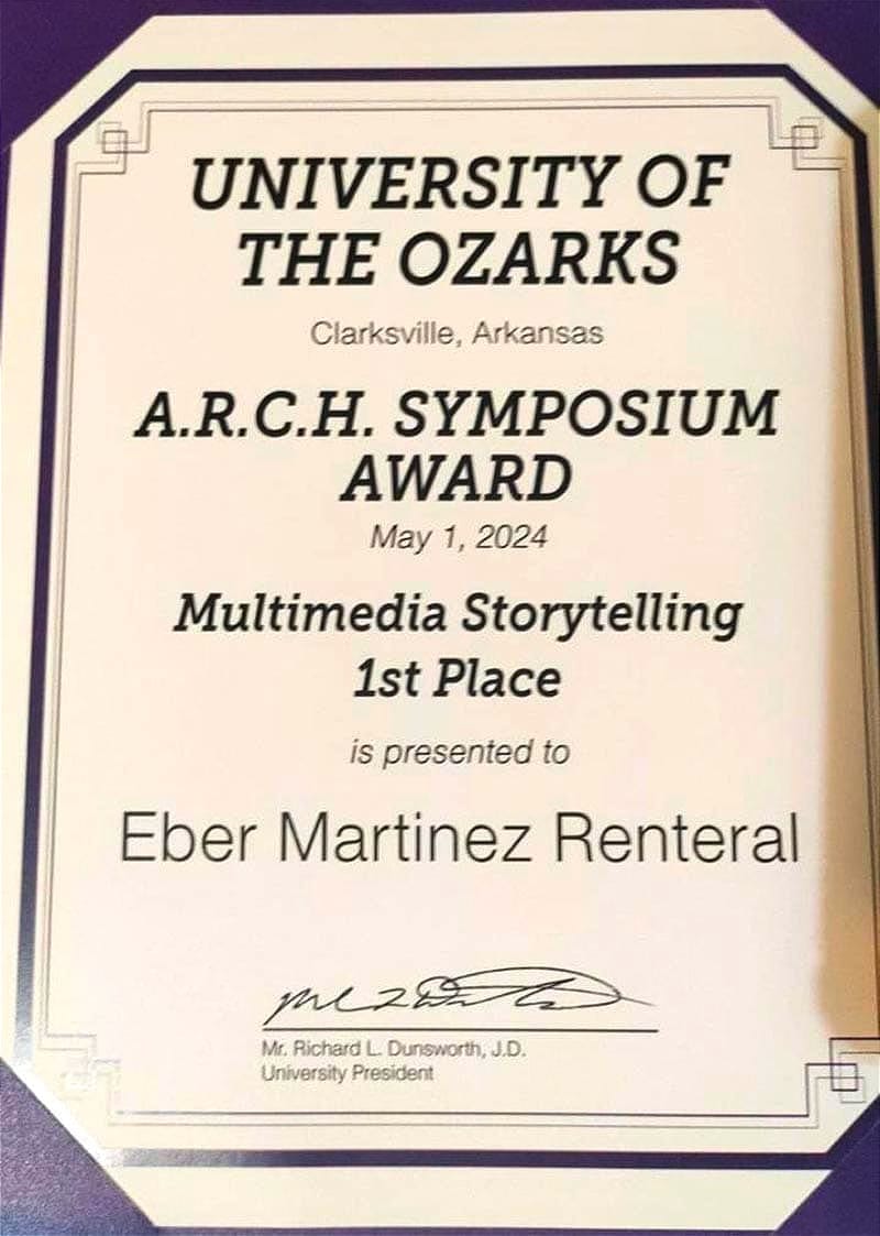 En su aventura educativa por la University of The Ozarks, Eber Israel contó con el apoyo incondicional de sus orgullosos padres, Mauricio Martínez Corneylli y Belén Renteral, así como de su hermanita Danna B. Martínez Renteral.