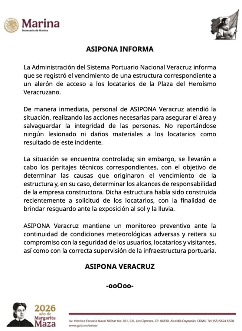 La Asipona Veracruz dio a conocer que se registró el vencimiento de una estructura correspondiente a un alerón de acceso a los locales de la Plaza Heroísmo Veracruzano, en un comunicado emitido luego del siniestro, dijeron que de manera inmediata personal de la Asipona atendió la situación.