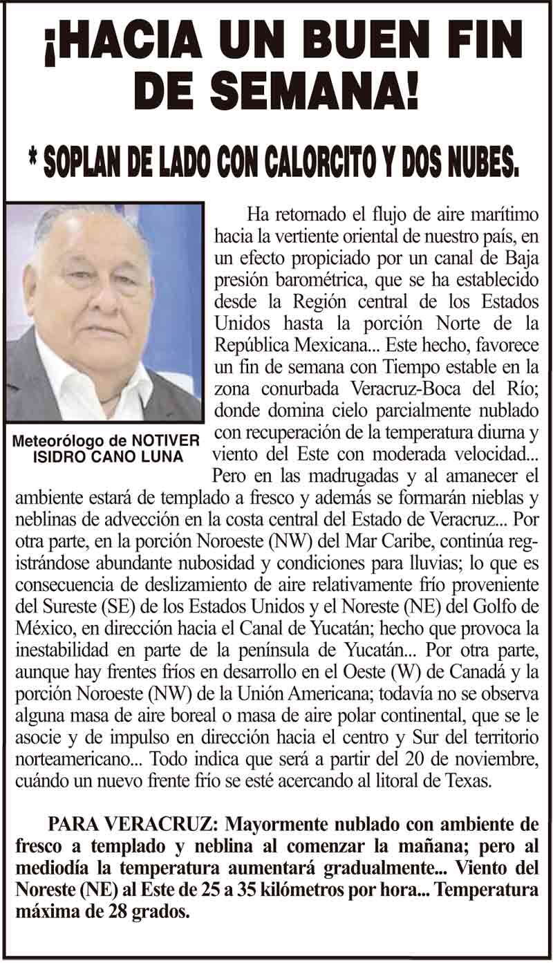 PRIMERA ¡HACIA UN BUEN FIN DE SEMANA! - *SOPLAN DE LADO CON CALORCITO Y DOS NUBES. 14 noviembre 2025 Más Noticias ¡ATRAPADOS! - HAY VERACRUZANOS ¡MUERE FAMILIA EN INCENDIO! - TRAGEDIA EN RÍO BLANCO ¡CAMIONES CHINOS A XALAPA! ¡SE LES APARECE MARYJOSE! LOS CARTONES FUE LA PERCEPCIÓN TÉRMICA... ¡MEGA-OPERATIVO POR CABALGATA! - *Cierres viales y de limpieza por Cabalgata nacional en Veracruz puerto NOTI-MEME | - NO AGUANTAN EL CALOR!! ¡HASTA GRANIZÓ! - PURAS BOLAS ¡CAYÓ EN XALAPA! - *Se repartirán ocho millones y medio