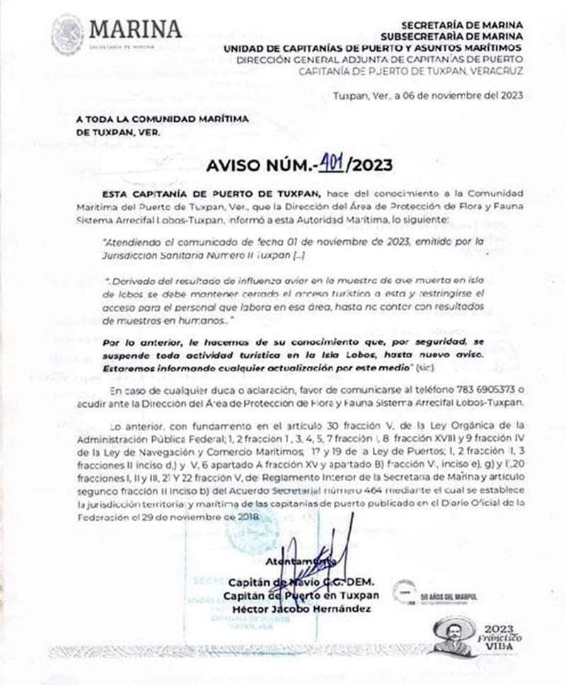 En Veracruz el tema no es ajeno, el pasado 8 de noviembre de 2023 se supo que hubo un brote de este padecimiento a la gripe aviar en la conocida como Isla lobos en la zona norte del Estado, ubicada entre Tuxpan y Tamiahua, se tuvo la actuación del Capitán de Puerto en Tuxpan, Capitán de Navío, Héctor Jacobo Hernández quien determinó el cierre de la conocida isla.