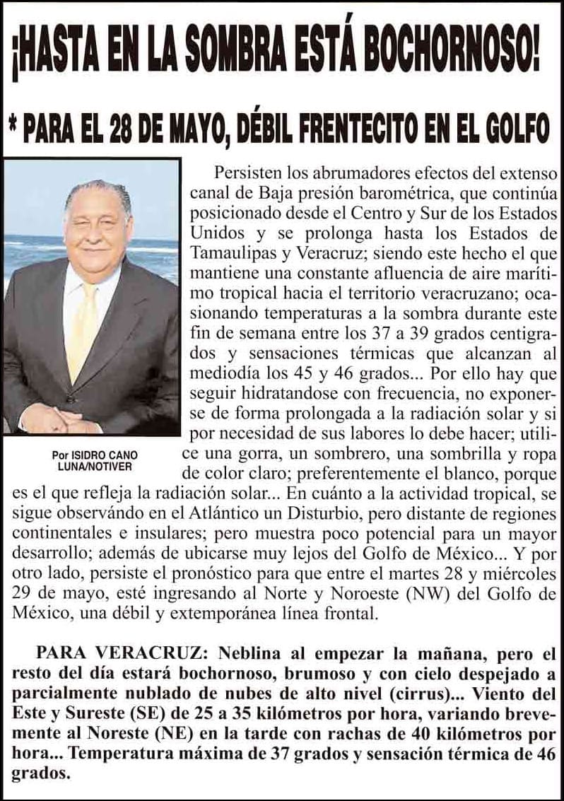 PRIMERA ¡HASTA EN LA SOMBRA ESTÁ BOCHORNOSO! - *PARA EL 28 DE MAYO, DÉBIL FRENTECITO EN EL GOLFO 25 mayo 2024 Más Noticias ¡YA HAY TERNA! - RAÚL PEIMBERT EN LA LISTA ¡“CEMENTERIO”! - DE ULÚAS ¡INAUGURA PATY OTRA CALLE! ¡NO LE CREYERON! - Y LO BUSCAN NOTI-MEME | - ECOS DEL INFORME! ¡VERÓNICA VA CON NAHLE! - Y AL CONGRESO ¡“FAST TRACK”! - *Mientras el Mariner salía y entraba de Pajaritos en Coatzacoalcos ¡OPERATIVO LUPE-REYES! ¡MANDAN LA BILLETIZA! - *Corea manda 150 mil dólares ¡CRISTINA GANA LA ELECCIÓN!