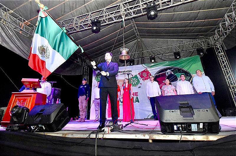 MEDELLÍN DE BRAVO, Ver. - Al grito de “Viva México” y ante un gran espectáculo de juegos pirotécnicos, miles de medellinenses conmemoraron el tradicional Grito de Independencia -en su aniversario 213- cuya ce-remonia estuvo encabezada por el alcalde Marcos Isleño Andrade y su comuna en pleno.