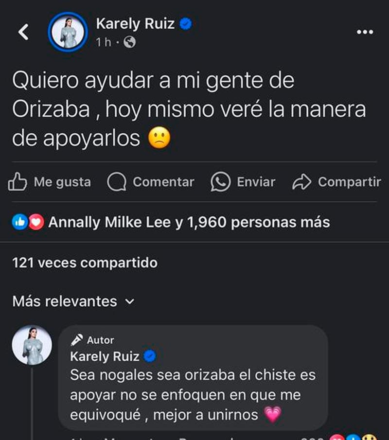 La influencer y modelo Karely Ruiz, manifestó su intención por ayudar a los afectados por el incendio registrado en las altas montañas de la zona centro del Estado, "quiero ayudar a mi gente de Orizaba, hoy mismo veré la manera de apoyarlos".