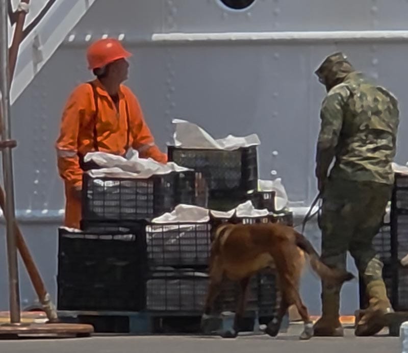 En el caso del Elcano, cada caja, bolsa, herramienta o suministro que se movía entre el muelle y el barco pasaba primero por el olfato de estos animales, que trabajan bajo un esquema de alta precisión y entrenamiento continuo.