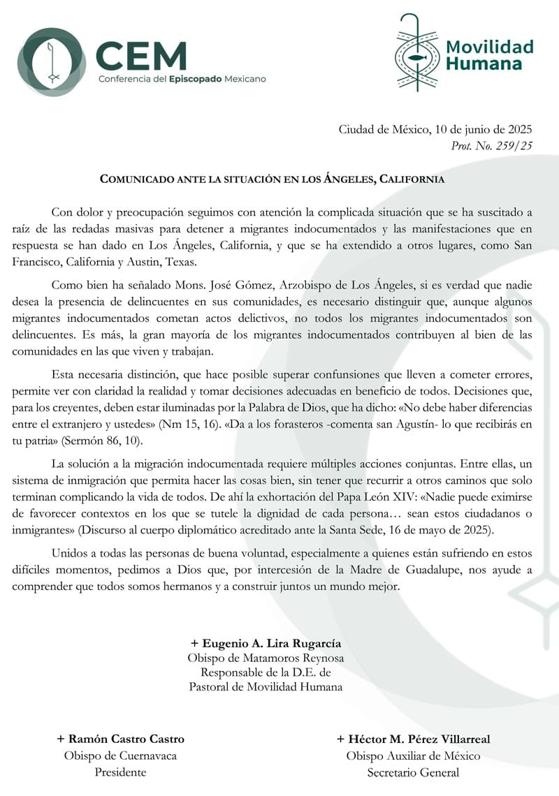 Al respecto, la Iglesia dijo que han seguido con atención la complicada situación que se ha suscitado a raíz de las redadas masivas para detener a migrantes indocumentados y las manifestaciones que en respuesta se han dado en Los Ángeles, California, y que se ha extendido a otros lugares, como San Francisco, California y Austin, Texas.