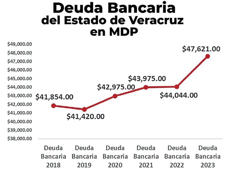 Con una lámina que contenían datos extraídos de los propios Informes Trimestrales de las Finanzas Públicas de SEFIPLAN, el congresista demostró que, en el 2018, la deuda bancaria tenía un saldo de 41 mil 854 millones de pesos y para el 2023, la deuda se incrementó a 47 mil 621 millones de pesos.