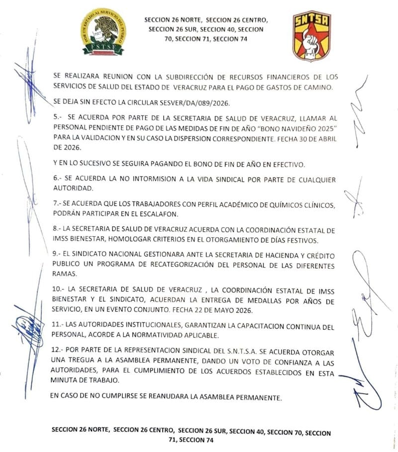 Finalmente, la minuta establece el cese de la circular SESVER/DA/089/2026 y el compromiso de las autoridades de no incurrir en actos de intromisión en la vida sindical.