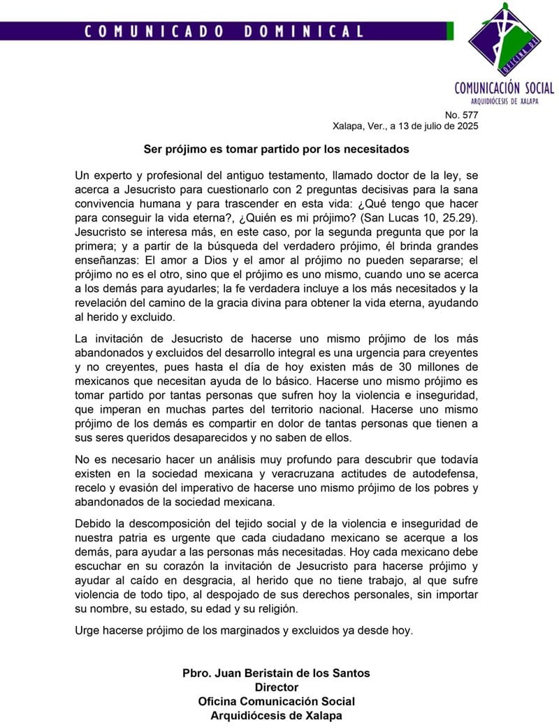 En su tradicional comunicado, señaló que la invitación de Jesucristo de hacerse uno mismo prójimo de los más abandonados y excluidos del desarrollo integral es una urgencia para creyentes y no creyentes, pues hasta el día de hoy existen más de 30 millones de mexicanos que necesitan ayuda de lo básico.