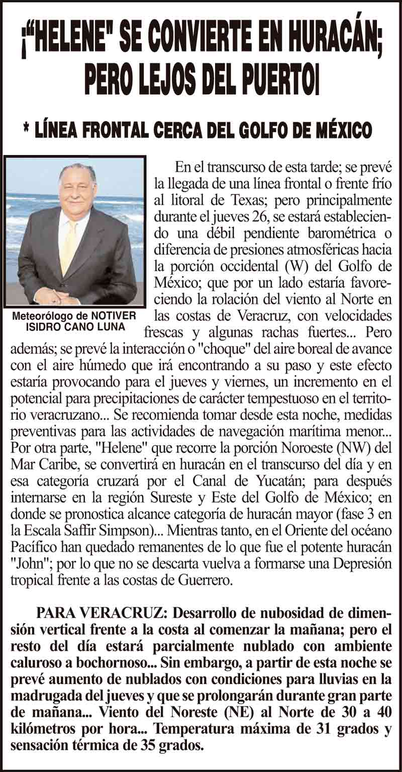 PRIMERA ¡“HELENE" SE CONVIERTE EN HURACÁN; PERO LEJOS DEL PUERTO! - *LÍNEA FRONTAL CERCA DEL GOLFO DE MÉXICO 25 septiembre 2024 Más Noticias ¡YA HAY TERNA! - RAÚL PEIMBERT EN LA LISTA ¡“CEMENTERIO”! - DE ULÚAS ¡INAUGURA PATY OTRA CALLE! ¡NO LE CREYERON! - Y LO BUSCAN NOTI-MEME | - ECOS DEL INFORME! ¡VERÓNICA VA CON NAHLE! - Y AL CONGRESO ¡“FAST TRACK”! - *Mientras el Mariner salía y entraba de Pajaritos en Coatzacoalcos ¡OPERATIVO LUPE-REYES! ¡MANDAN LA BILLETIZA! - *Corea manda 150 mil dólares ¡CRISTINA GANA LA ELECCIÓN!
