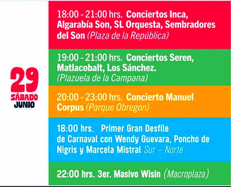 18:00 Hrs.- Primer Gran Desfile de Carnaval con el influencer y actor regiomontano Poncho De Nigris, su esposa, la influencer Marcela Mistral y la influencer Wendy Guevara. (de Sur a Norte).