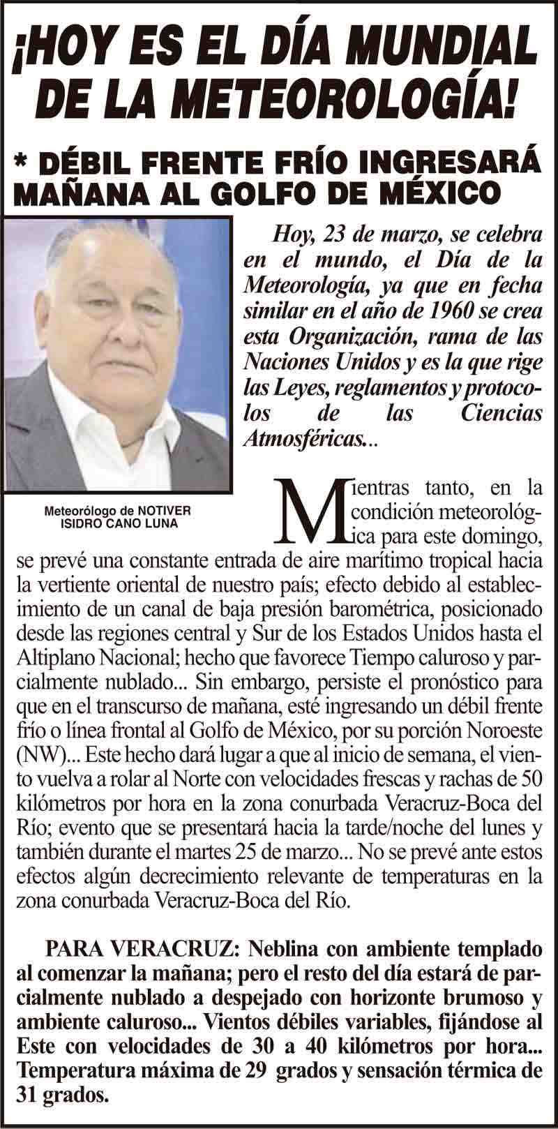 PRIMERA ¡HOY ES EL DÍA MUNDIAL DE LA METEOROLOGÍA! - *DÉBIL FRENTE FRÍO INGRESARÁ MAÑANA AL GOLFO DE MÉXICO 23 marzo 2025 Más Noticias ¡YA HAY TERNA! - RAÚL PEIMBERT EN LA LISTA ¡“CEMENTERIO”! - DE ULÚAS ¡INAUGURA PATY OTRA CALLE! ¡NO LE CREYERON! - Y LO BUSCAN NOTI-MEME | - ECOS DEL INFORME! ¡VERÓNICA VA CON NAHLE! - Y AL CONGRESO ¡“FAST TRACK”! - *Mientras el Mariner salía y entraba de Pajaritos en Coatzacoalcos ¡OPERATIVO LUPE-REYES! ¡MANDAN LA BILLETIZA! - *Corea manda 150 mil dólares ¡CRISTINA GANA LA ELECCIÓN!