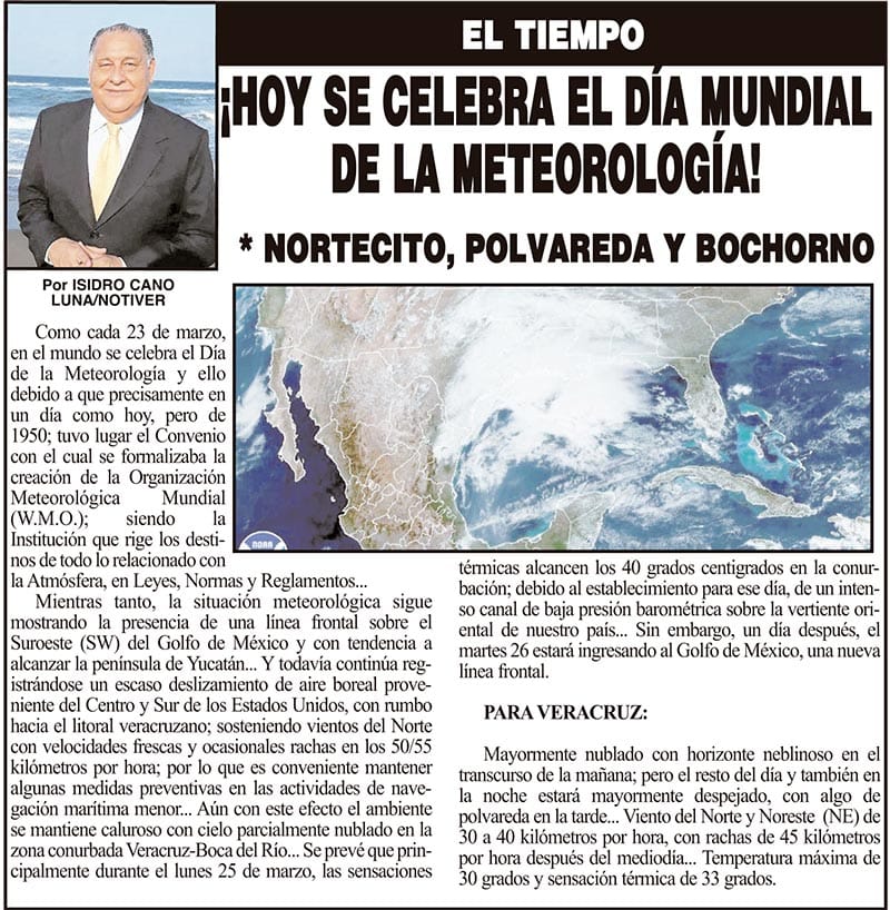 PRIMERA ¡HOY SE CELEBRA EL DÍA MUNDIAL DE LA METEOROLOGÍA! - * NORTECITO, POLVAREDA Y BOCHORNO 23 marzo 2024 Más Noticias LA PORTADA - SÁBADO 6 DE DICIEMBRE 2025 ¡SE ESTÁ FORMANDO UN INTENSO "NORTE" PARA EL LUNES 8! - *UN FIN DE SEMANA CON CALOR, BRUMA Y DEL ESTE ¡YA HAY TERNA! - RAÚL PEIMBERT EN LA LISTA ¡“CEMENTERIO”! - DE ULÚAS ¡INAUGURA PATY OTRA CALLE! ¡NO LE CREYERON! - Y LO BUSCAN NOTI-MEME | - ECOS DEL INFORME! ¡VERÓNICA VA CON NAHLE! - Y AL CONGRESO ¡“FAST TRACK”! - *Mientras el Mariner salía y entraba de Pajaritos en Coatzacoalcos ¡OPERATIVO LUPE-REYES!