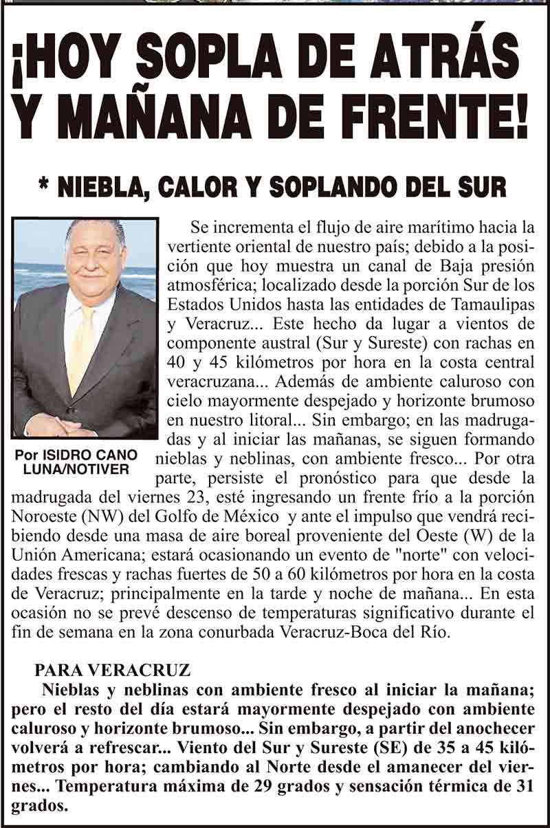 PRIMERA ¡HOY SOPLA DE ATRÁS Y MAÑANA DE FRENTE! * NIEBLA, CALOR Y SOPLANDO DEL SUR 22 febrero 2024 Más Noticias ¡YA HAY TERNA! - RAÚL PEIMBERT EN LA LISTA ¡“CEMENTERIO”! - DE ULÚAS ¡INAUGURA PATY OTRA CALLE! ¡NO LE CREYERON! - Y LO BUSCAN NOTI-MEME | - ECOS DEL INFORME! ¡VERÓNICA VA CON NAHLE! - Y AL CONGRESO ¡“FAST TRACK”! - *Mientras el Mariner salía y entraba de Pajaritos en Coatzacoalcos ¡OPERATIVO LUPE-REYES! ¡MANDAN LA BILLETIZA! - *Corea manda 150 mil dólares ¡CRISTINA GANA LA ELECCIÓN!