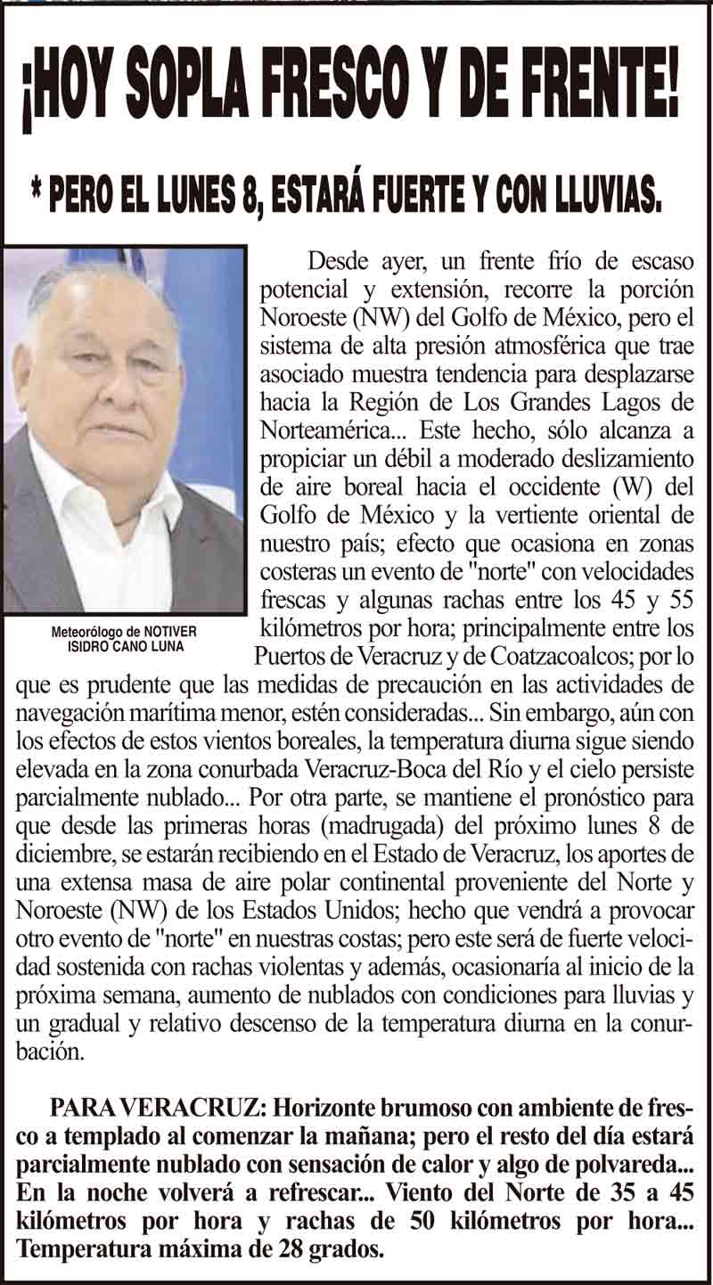 PRIMERA ¡HOY SOPLA FRESCO Y DE FRENTE! - *PERO EL LUNES 8, ESTARÁ FUERTE Y CON LLUVIAS. 5 diciembre 2025 Más Noticias LA PORTADA - VIERNES 24 DE ABRIL 2026 ¡LLEGAN CHINOS A VER EL TRANVÍA! ¡PRIMER LUGAR EN HOMICIDIOS DOLOSOS! - TENIA QUE SER ¡MARYJOSE TENDRÁ SU HOSPITAL! ¡LOS DEJARON SOLOS! - A FAMILIARES DE LA DOCTORA ASESINADA ¡SE LO MOCHAN A EX ALCALDE! - DE COATZA ¡RECONOCEN A CONCHITA DÍAZ CHÁZARO! - *Es la Cronista de la Ciudad NOTI-MEME | - QUÉ LIBRO VAS A REGALAR! ¡SIGUE LA RACHA! ¡CONSTERNACIÓN! - *Muere el profesor Roque Velázquez Rivera