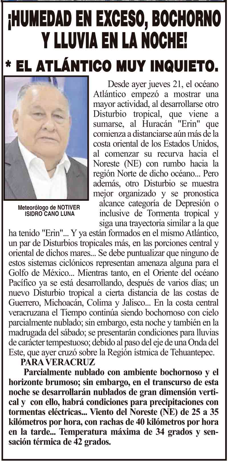 PRIMERA ¡HUMEDAD EN EXCESO, BOCHORNO Y LLUVIA EN LA NOCHE! - *EL ATLÁNTICO MUY INQUIETO. 22 agosto 2025 Más Noticias ¡HOY SOPLA FRESCO Y DE FRENTE! - *PERO EL LUNES 8, ESTARÁ FUERTE Y CON LLUVIAS. LA ENCUESTA | - ME ESTÁS OYENDO INÚTIL?... ¡CON BAILONGOS QUIEREN AYUDAR A LOS DAMNIFICADOS DEL NORTE! - *El mismo Alor, toca los timbales ¡YA SE LA APROBARON! - REFORMA PARA LA FISCALÍA ESTATAL NOTI-MEME | - ASÍ ESTUVO EL INFORME... ¡MÁS DE 9 MIL MILLONES! - *Eso costaría cancelar en Veracruz al Grupo MAS ¡LE DAN LUZ VERDE! - DESDE GUATEMALA ¡EL CUARTO! ¡Y COM-PA-RE-CIÓ! - ÁNDALE... ¡NO SE VA LISBETH AURELIA! - *Descarta ir a la Fiscalía y que seguirá como magistrada